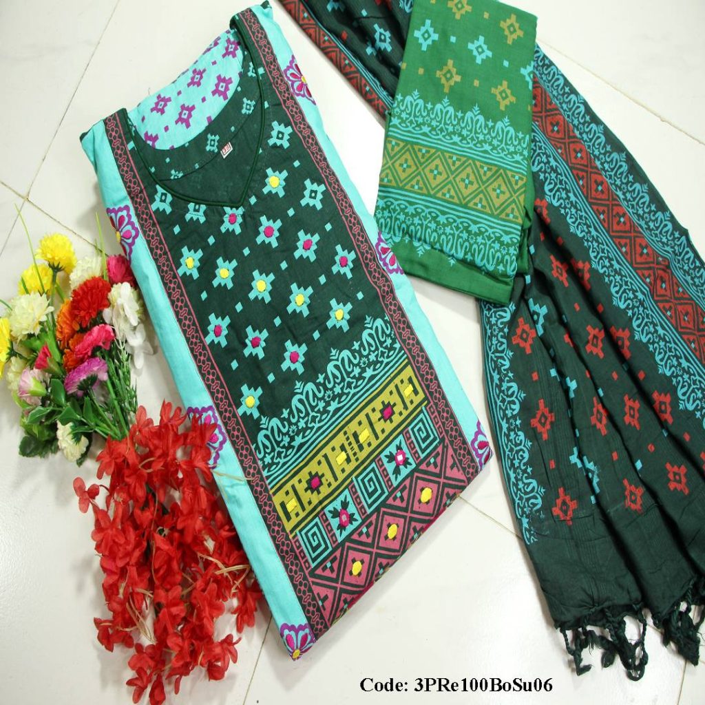আড়ং স্টাইলের রেডি থ্রি পিস রং গ্যারান্টি কাপড়: জামা ও সেলোয়ার-সুতি